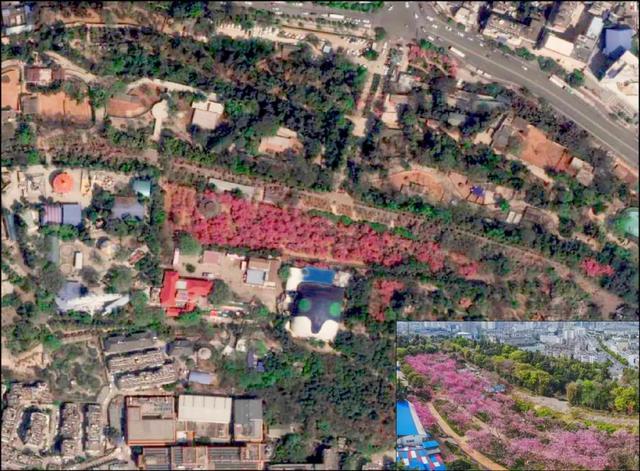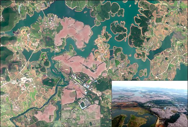 红枫湖畔,隶属于贵安新区高峰镇。占地 2.4 万余亩的农场上,种植了近 70 万株名贵樱花,其面积之广、密度之大,堪称"世界之最"。在遥感影像上,我们看到贵州高峰山上的植被已非常的茂密,万亩的樱花树已花开绽放,阵风拂过,樱花落地似雪海。盛开的樱花,仿佛将整个城市点缀上浪漫的粉色。