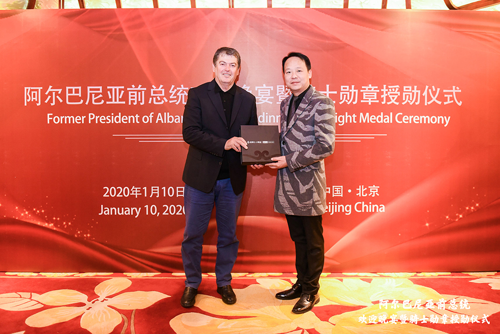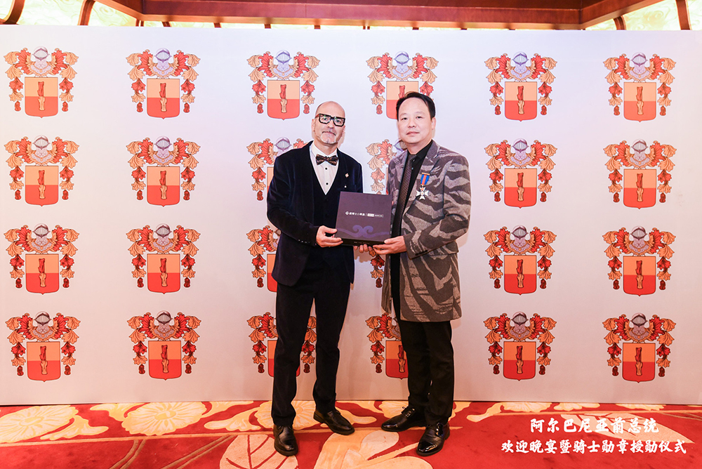 图为痘博士谢光辉将WKA小黑盒礼盒赠送给博斯科亲王