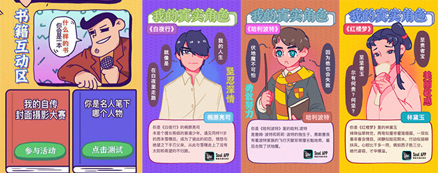 除此之外,在书籍互动区,Soul还发布了“我的真实角色”,让读者身临其境体验《白夜行》、《哈利波特》、《红楼梦》的精彩桥段,通过性格测试,体会一把做主角的快乐。