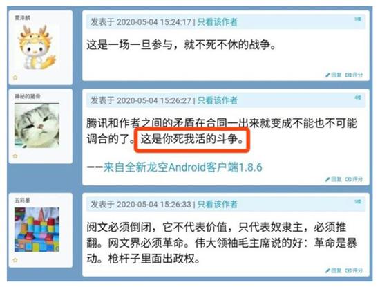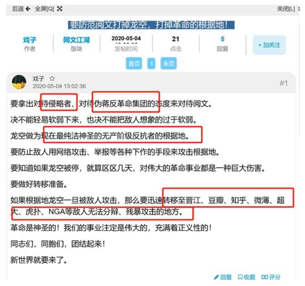 从4月27日阅文五高管集体“荣退”开始,部分阅文作者就在龙的天空论坛(下称:龙空网)聚集,讨论议题涉及五高管离职原因,免费阅读模式与付费模式之争,最后聚焦在阅文“新合同”中版权归属问题、分成比例调整、免费阅读影响收入等方面。在此后数日内,由作者和网友合力“出征”,将讨论逐渐扩散至微博、知乎、贴吧、A站和B站等讨论区。