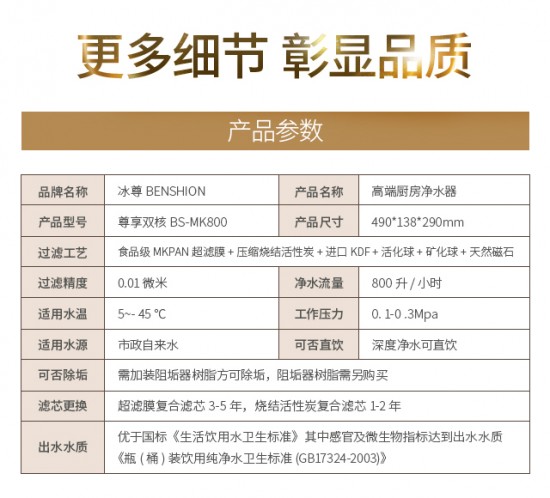冰尊BS-MK800的“双核”净水技术和外观设计,是世界净水器行业首创,世界绝大部分净水器品牌都模仿和抄袭冰尊BS-MK800的外观设计,但外观可以抄袭,核心的净水技术是无法抄袭了,所以消费者在实际使用过程就会发现还是冰尊BS-MK800过滤效果最好,口感最佳,最能保护家庭成员的净水安全健康。