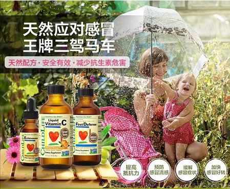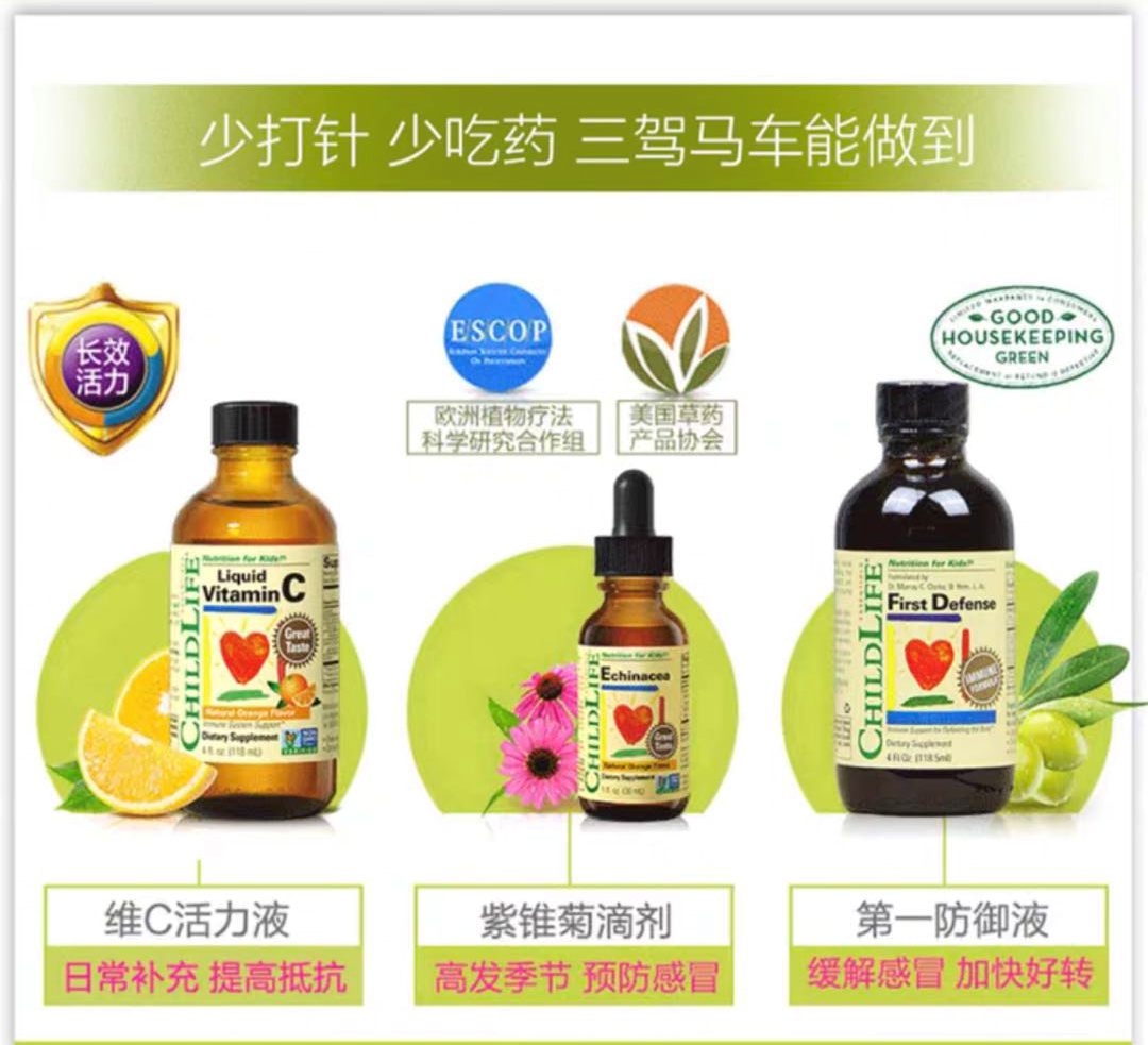 童年时光三驾马车包括童年时光维生素C、童年时光紫锥菊滴剂和童年时光第一防御液。维生素C能够帮助孩子增强免疫力;紫锥菊滴剂具有天然的免疫调节作用,能缩短感冒病程1-4天;第一防御液含有橄榄叶提取物、贯叶连翘提取物、葡萄糖酸锌等3种草本,2种矿物质成分,能够缓解感冒症状,并减少抗生素危害。