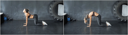 跪地,双手撑起上身,交替拱起屈曲上体。动作要点是,保持手掌贴地,将大腿垂直于地面。注意保持收紧核心,并注意呼气吸气的节奏。