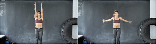 挺立站直,手臂画大圈,打开胸部。动作要点是,当手臂打开时,肩胛骨要感受到挤压。