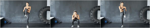 深蹲的同时,抬起膝盖超过肚脐位置。动作要点是,保持脚尖朝前,另外,膝盖不超过脚尖。需要注意的是,应保持挺胸收腹,用脚后跟保持重心。