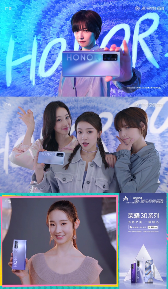 在第一期节目中,许潇晗、林君怡、赵粤、张艺凡四位学员携手荣耀30系列拍摄广告大片;视频一经发布,就在微博平台收获了超过百万的播放量,她们的青春活力充分诠释了荣耀30系列的潮美特点。外形设计大胆前卫的荣耀30系列无论与哪种风格的学员都能完美搭配。