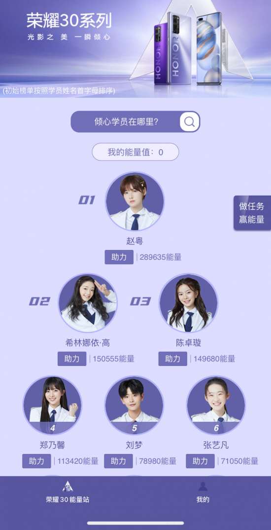 同时,由荣耀30系列建立的荣耀30能量站也在两周左右的时间内吸引赵粤、张艺凡、希林娜依·高等多位人气学员的粉丝团前来打投。超强华为系曝光资源到底花落谁家,现在还是未知数。