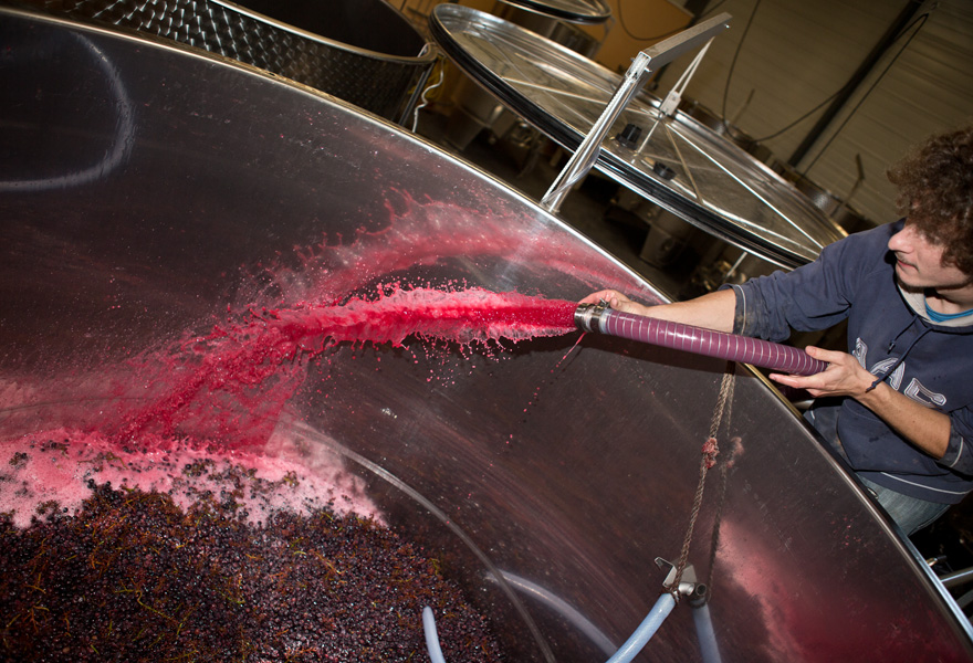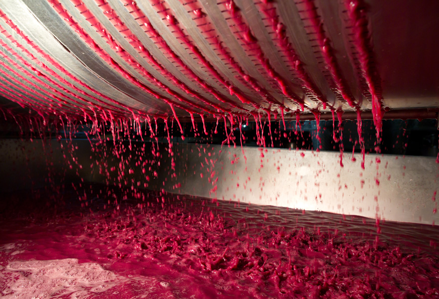 葡萄采收后会进行去梗和破皮,但这不是必须工序,因为有些酒庄会特意保留果梗,保持果实颗粒完整,以便进行整串发酵。破皮的过程需尽可能轻柔,避免破坏葡萄籽,释放出苦油和单宁。