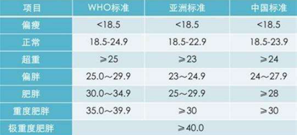纤译健康认为判断一个人的体型是肥胖、胖、或者正常,需要用到一个概念去衡量:BMI,也就是身体质量系数(Body Mass Index)。BMI的计算公式非常简单:BMI=体重/身高的平方(国际单位kg/㎡)。对于中国人来说,正常健康的成年人BMI应该在18.5-23.9之间;如果BMI大于24,但是小于28,就是偏胖的体型了,可能只是能看见小肚腩;如果BMI突破28,就是肥胖症了,这是一种WHO确认的疾病,胖得很显而易见了。