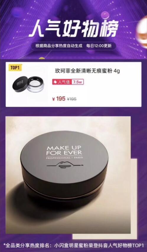 其间,TOP君发现,LVMH旗下专业彩妆品牌MAKE UP FOR EVER(以下简称MUFE)上周五在小店独家首发的“小闪盒”IP项目mini蜜粉“出道即走红”:不仅限量发售的2万件新品卖断货,还在当天登上“抖音人气好物榜 TOP1”。且品牌旗下其他明星单品也销量可观,5.5—5.8开店期间创下430W+销售额。