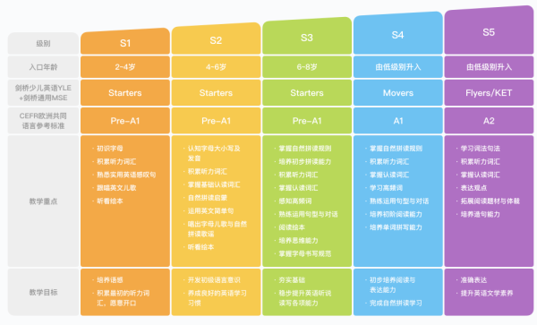 下面这张图是我从斑马AI课官网上截取的一个斑马英语系统课的课程体系图。可以看出来,课程体系划分还是很科学的,分了5个阶级,很符合各个年龄段孩子的能力特点。不过有一点需要注意的是,S4和S5的课程难度比较大,不建议没有任何系统学习基础的孩子直接报名,最好是从S1-S3开始学习。