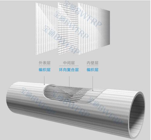 BWFRP纤维编织管由于其独特的生产工艺,使得产品在生产过程中无法随意调整工艺参数以改变管壁厚度,保障了产品的质量,更为独特的是BWFRP管道具有三层构造:内外均为交叉编织层,中间为环向与纵向编织层,不同编织角度设计的内外编织层与纵向、环向复合的中间层共同构成了这样独特的复合材料产品。