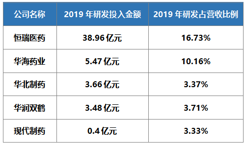 从恒瑞医药、华海药业等药企披露的2019年度研发投入金额来看,恒瑞医药持续保持老大哥的地位,其次是华海药业。尽管华海药业与恒瑞医药的研发投入金额存在差距,但从研发投入金额占营收比例来看华海药业表现不俗。值得注意的是,近年来华海药业大力推进生物药、创新药、仿制药等项目研发,研发费用同比增长 17.79%。