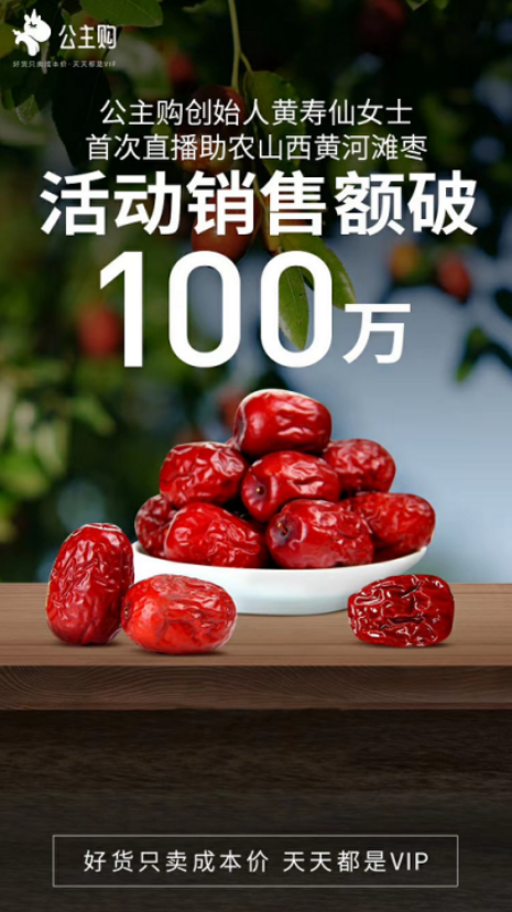 据了解,本次公主购“地道中国味”直播助农山西黄河滩枣活动首站告捷:1小时卖出10万斤红枣,当天售出数万单,成交额破100万。