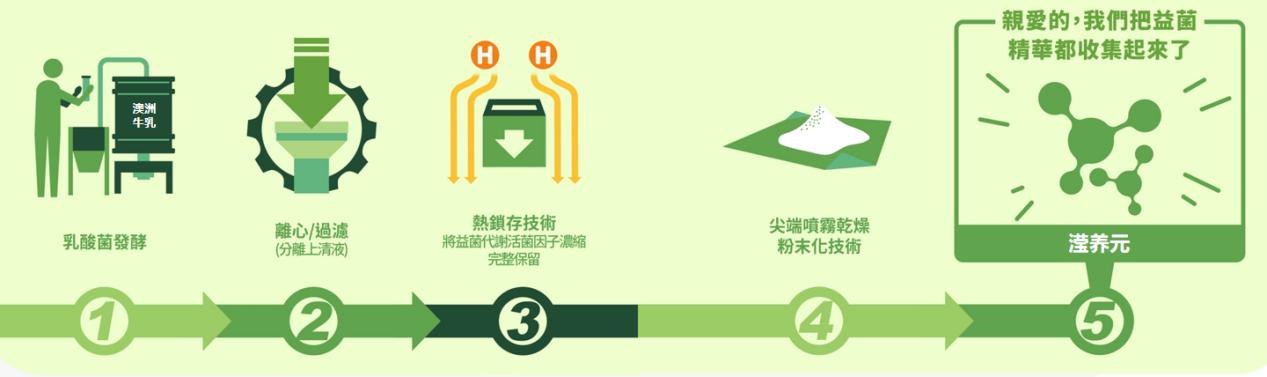 精选功效益菌+澳洲牛乳经48小时充分发酵,并运用独特的HeaLAC热锁存技术处理下,进行微生物灭活,降低后酸化反应,锁住益生菌发酵精华,在多层复合抗性微粒技术处理下提取出天然纯净的滢养元。生产过程中打破了常规活菌型原料难以跨越的鸿沟,独特的热锁存生产技术,增加了滢养元储存条件的稳定性,更加安全可靠。体外预消化萃集代谢机能分子,解决了益生菌需要先定殖的过程,也排除了益生菌会在不同个健康促进之间的差异性。