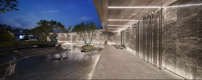 外部飞翼造型的空间,造型四面玻璃幕墙,两侧拾级而上,步道两侧种植规则树阵,结合花钵和水景,让回家的路变的更愉悦