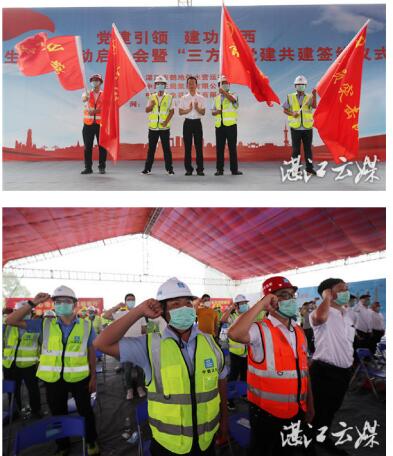 在“三方”党建共建签约仪式上,麻章镇党委、鹤地供水营运有限公司党支部、中建三局集团有限公司·中国水电基础局有限公司联合体湛江市引调水工程第一标段项目党支部,三方联合签订协议书。据悉,签订后各单位将成立共建工作联系小组,强化党建工作载体,营造良好施工氛围,进一步推进党建和生产互融互促,为打造精品工程提供坚实的政治保障。随后,麻章镇副镇长潘秋定为“三号”(党员先锋号、工人先锋号、青年文明号)联创授牌;来自中建三局的相关负责人彭勇为“先锋型”党支部授牌;活动现场还为党员先锋队和青年突击队授旗,进一步发挥好基层党支部的战斗堡垒作用。与会人员在联合体项目经理的带领下,进行了庄严宣誓。