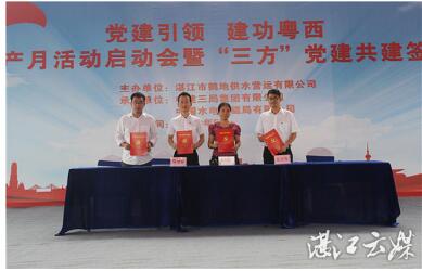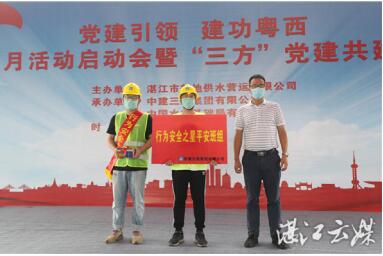 5月28日,中建三局施工的湛江市引调水工程项目,联合麻章区麻章镇、粤海水务集团、中国水电基础局等单位,在项目部施工现场举行“党建引领 建功粤西”安全生产月活动启动会暨“三方”党建共建签约仪式。市水务局、市应急管理局、麻章镇相关领导及粤海水务集团、湛江市鹤地供水营运有限公司、广东宏茂建设管理有限公司、中国水电基础局、中建三局相关代表及部分工人参加了活动。