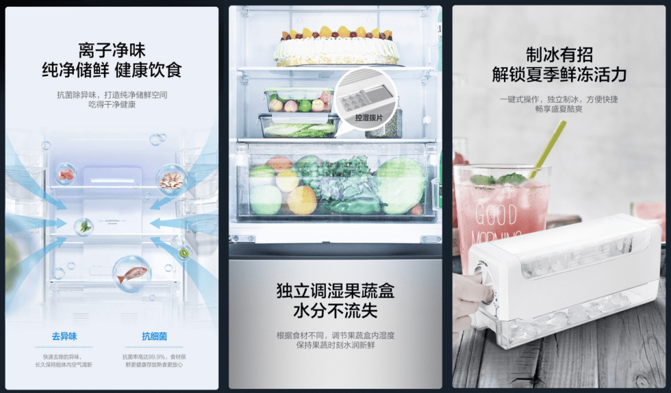 说了半天,这款晶弘系列反向定制冰箱到底有多么全面的功能呢?除了风冷无霜、电脑控温、35分贝静音、变频节能、纤薄机身等相对基础的功能外,还结合用户需求新增了一系列创新功能。首先就是大家都想要的抗菌除异味功能,可以通过离子净味技术快速去除异味。正值疫情,它还能抑制细菌滋生,抗菌率可达到99.9%以上。其次是让水果蔬菜保持水润新鲜的干湿分离功能。这款冰箱设计了具有独立调湿功能的果蔬盒,不管是苹果、黄瓜还是土豆,都能以适宜的湿度进行存储。尤其想要分享给大家的是它的旋转制冰功能,一键式操作特别方便。天气这么热,在家里随时来上一杯加冰的可乐或啤酒,想想就很惬意。
