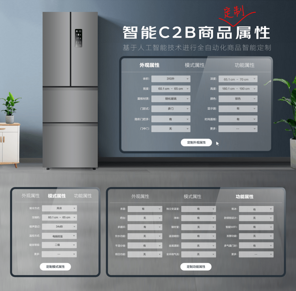 实际生活中对冰箱的痛点这么多?那么如何才能让家电制造厂商听到消费者的呼声,生产出一款真正能满足我们日常痛点需求的冰箱呢?下面让我来为你一一解答。现在在制造业流行着一个词叫做反向定制,是指通过C端消费者脱敏后的公开数据指导B端生产厂商对产品进行设计和生产,也即Customer to Business(C2B)模式。但现在已有的反向定制方案基本都是基于人工方法的第一代反向定制模式。他们往往通过自身的一些行业经验并结合一部分用户的问卷调研,对商品进行设计和改良。但这样的方法无法听到所有用户的呼声,也难以定制出冰箱这样包含着上百个不同属性和功能的复杂商品。针对这一难题,京东智联云自主研发出业界首款全自动化的智能C2B系统,可以基于前沿人工智能技术对商品进行全自动化,智能化的定制,从而能够支撑更智能、更强大的第二代反向定制模式。