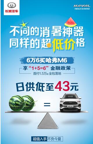 想要享受夏日幸福,也许只是两个甜脆的西瓜,也许只是两杯新鲜的果茶。但没有想到的是,要享受夏日舒心出行,每天也只要西瓜或果茶的花费。"消暑神器"哈弗M6推出"1+5=6"金融购车政策,首付低至1.5万元就可以全包落地开回家,更有5年超长贷期,日供低至43元。