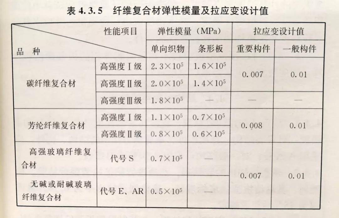 4. 纤维复合材的弹性模量及拉应变设计值应按表4.3.5采用。