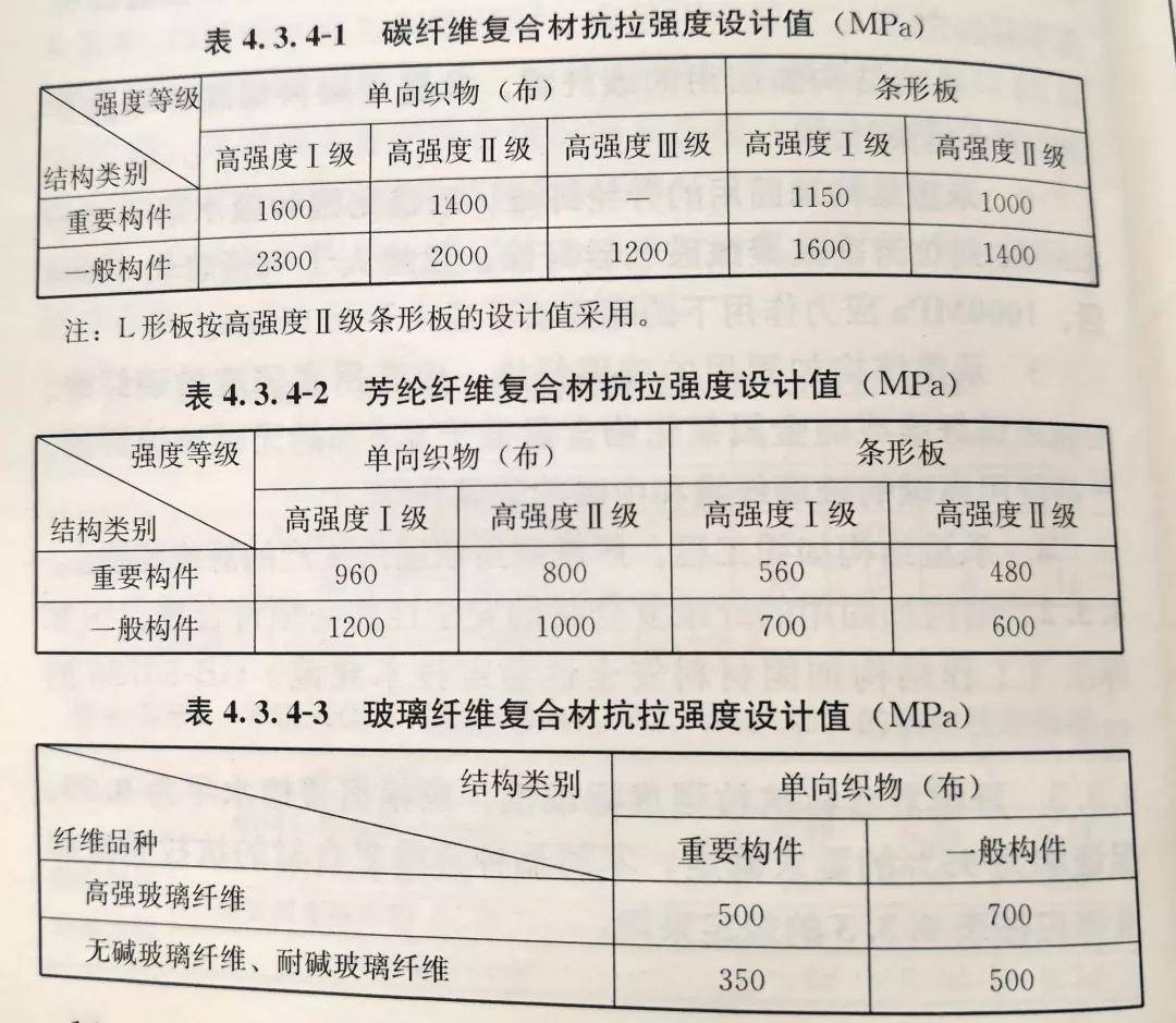 3. 不同品种纤维复合材的抗拉强度设计值,应分别按表4.3. 4-1、表4.3.4-2及表4.3.4-3采用。