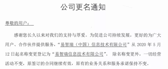 事实上,早于5月12日,易智瑞便向用户发布了更名通知。通知显示,公司名称由“易智瑞(中国)信息技术有限公司”变更为“易智瑞信息技术有限公司”。